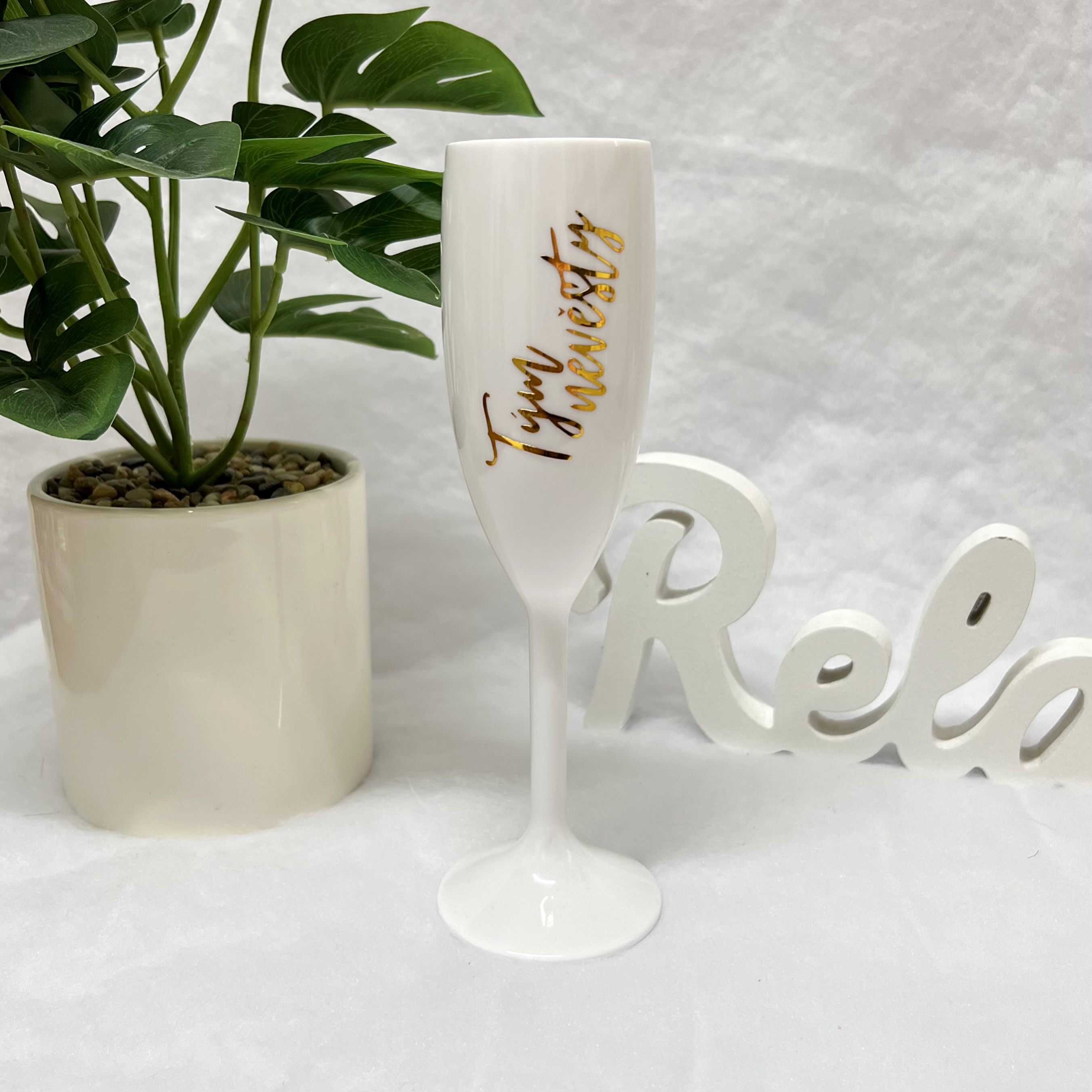 Nerozbitná, plastová sklenička s vinylovým zlatým polepem.