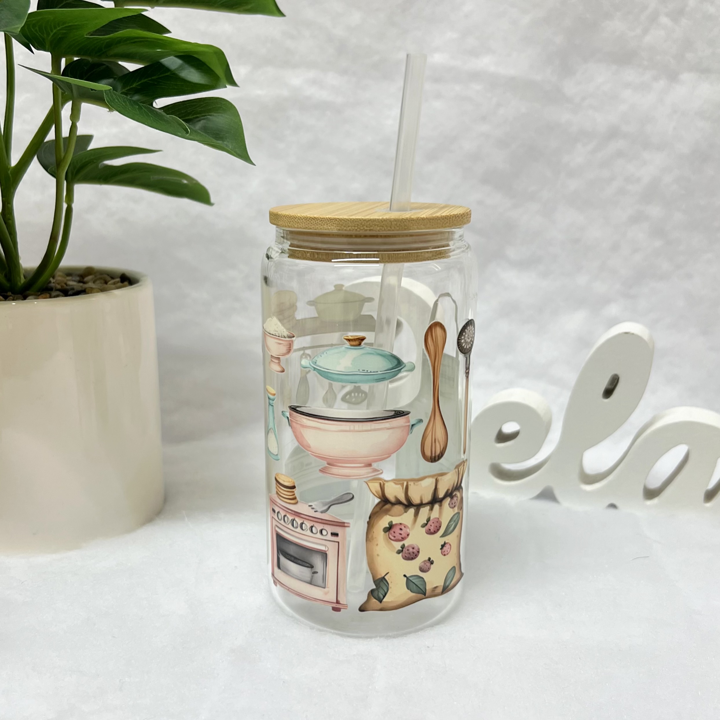 Stylová sklenička, která zaujme na první pohled! Ozdobená jemnou ilustrací kuchyňských motivů – od vařečky až po zástěru. Přináší domáckou atmosféru a špetku nostalgie do každého doušku. Skvělá na ledovou kávu, limonádu nebo smoothie.