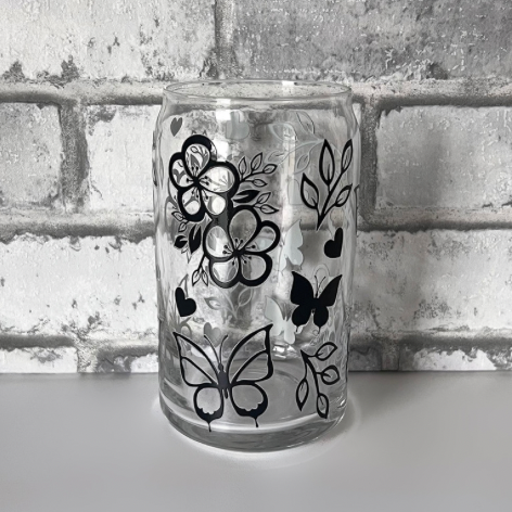 Sklenička ve tvaru plechovky s vinylovým polepem.