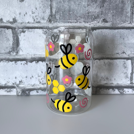 Sklenička ve tvaru plechovky s vinylovým polepem.